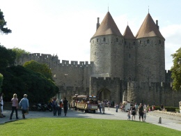 Das Bild links zeigt einen Teil der Stadtmauer von Carcassonne. Die sogenannte Cité von Carcassonne ist eine vollständig erhaltene mittelalterliche Stadt, die sich zu Fuß erkunden läßt.