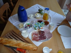 Den Franzosen reicht ja zum Frühstück eine Tasse Kaffee und ein Stück Baguette oder ein Croissant. Wir bieten ein reichhaltiges Frühstück mit Frühstücksei, Marmelade, Wurst, Käse,... an.